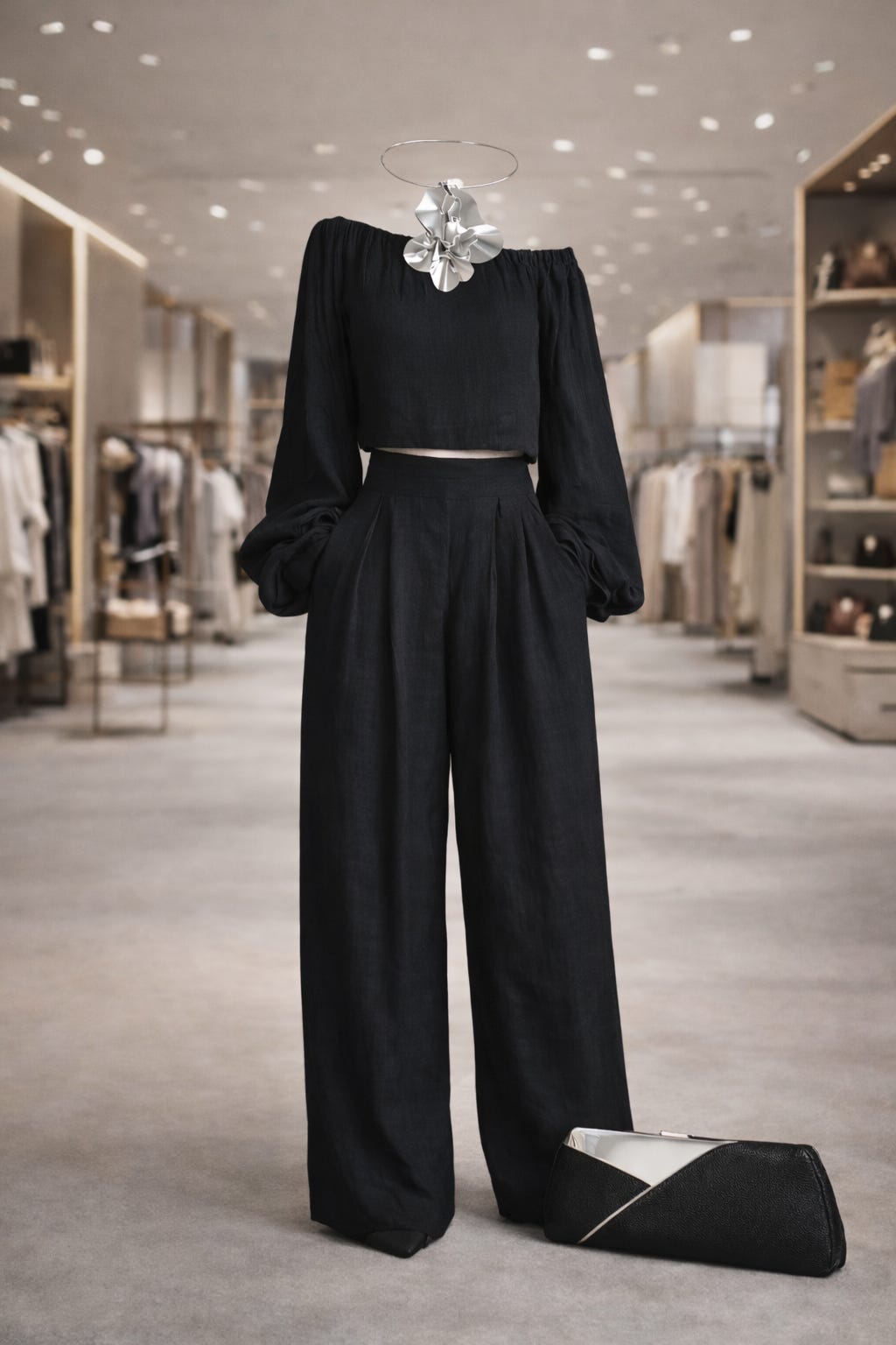 How one sculptural necklace transforms a minimalist black set into a statement of modern elegance.